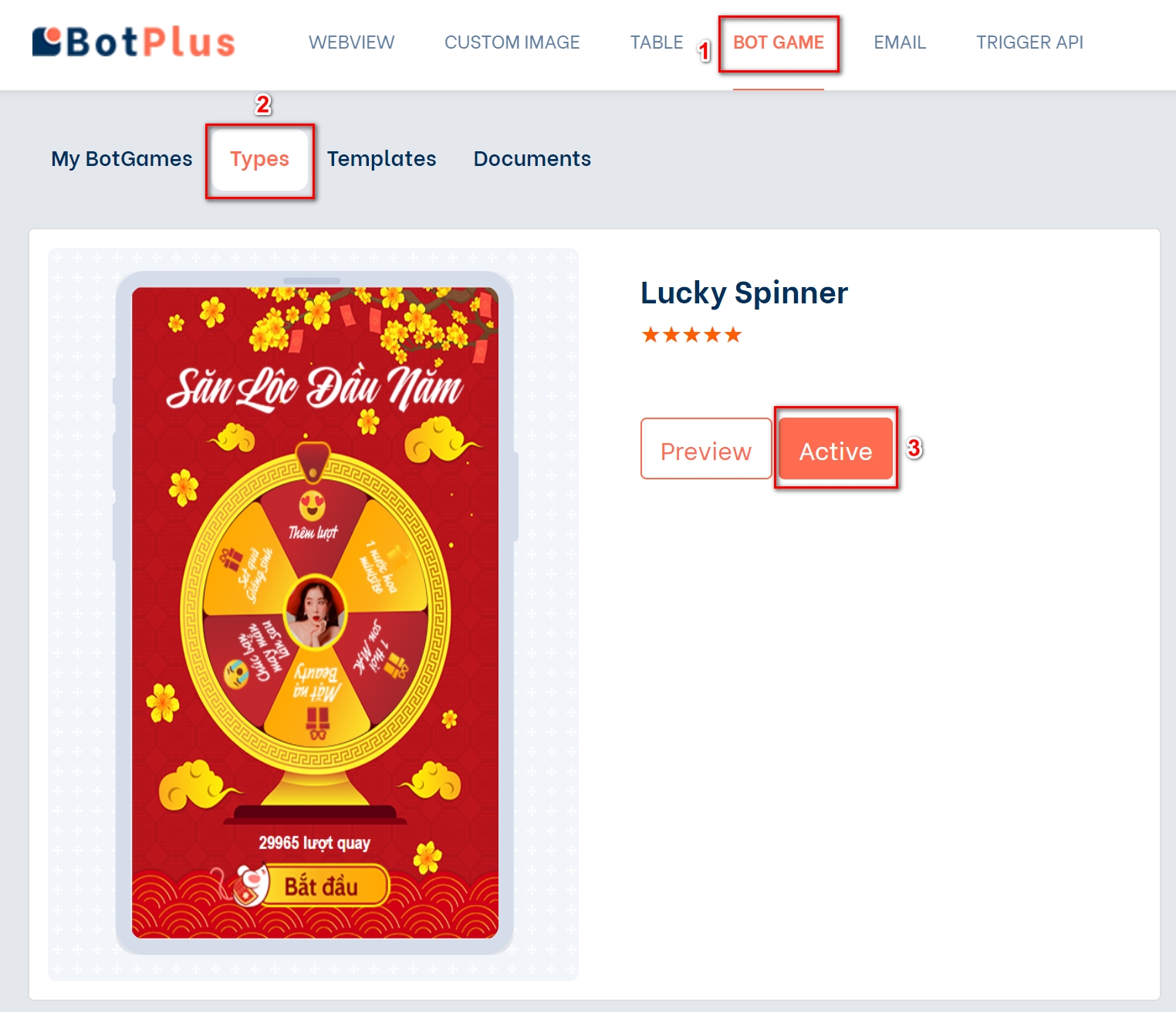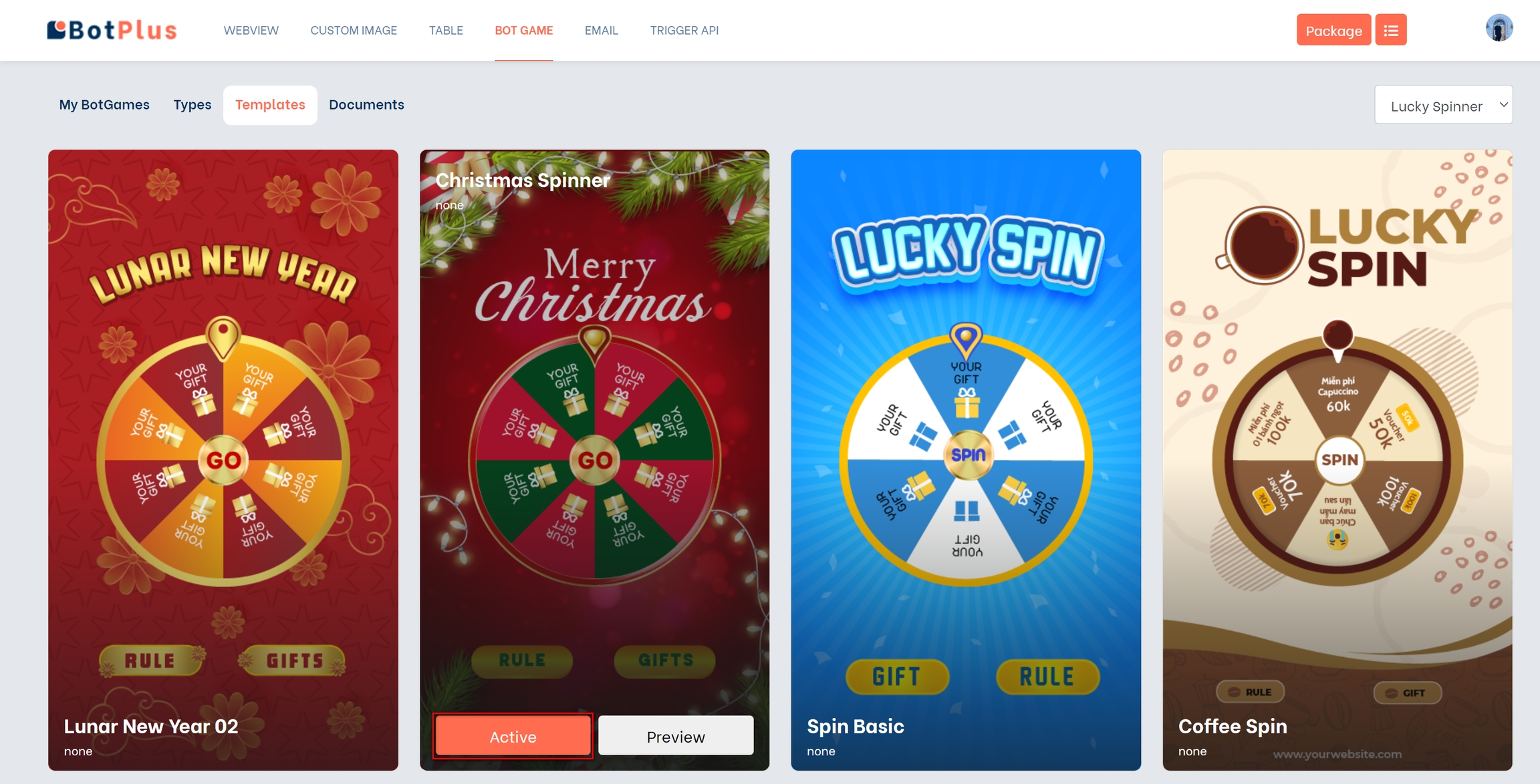 Sau khi ấn vào active thì hệ thống sẽ list ra các giao diện (template) của bot game cho bạn lựa chọn. Đối với mỗi loại bot game sẽ có các giao diện khác nhau (trong hình là các giao diện của bot game Lucky Spinner)