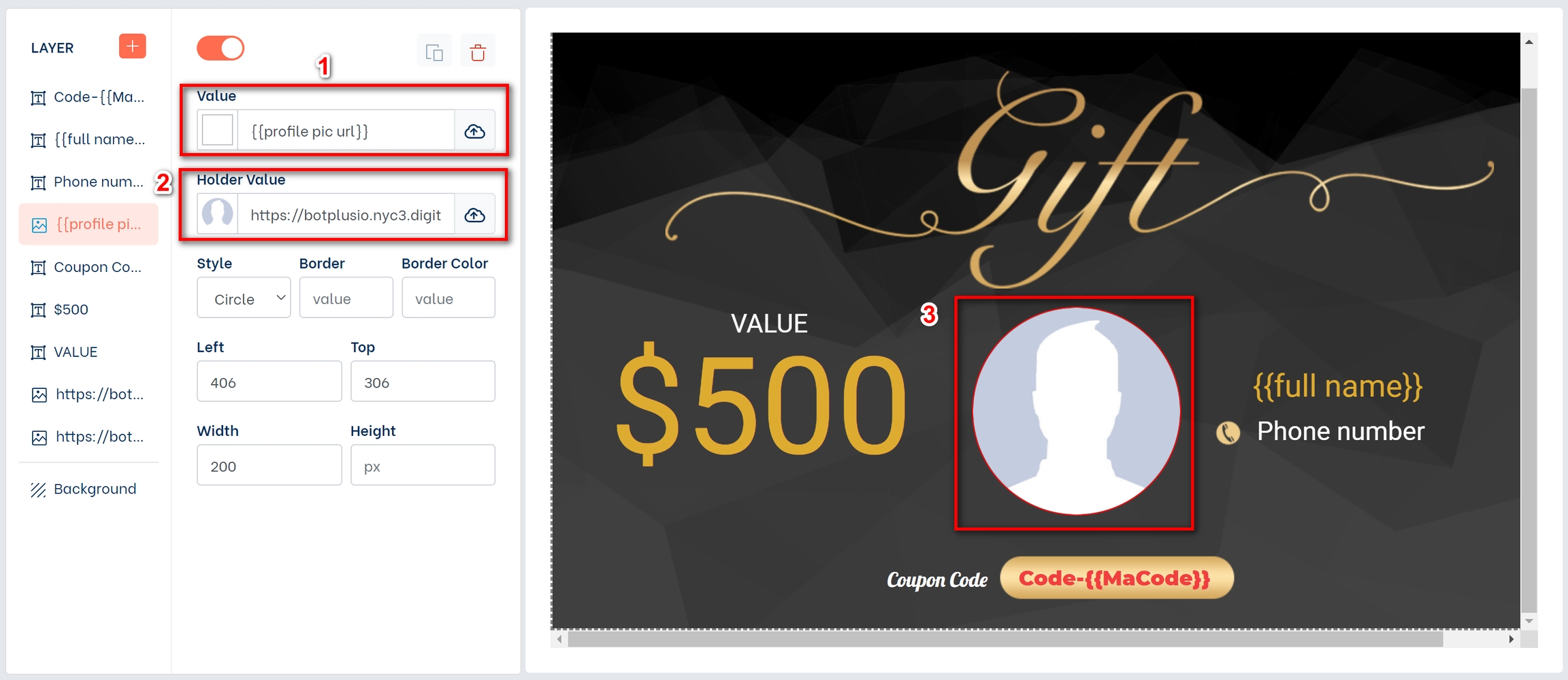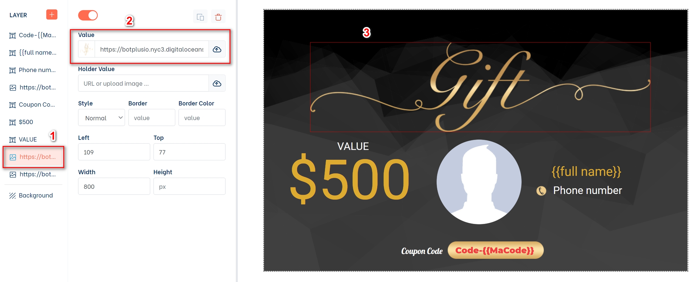 Phần Holder Value (2) là chỗ bạn update 1 ảnh "giả" lên, dùng để hình dung khi ảnh thật hiển thị nó sẽ như thế nào. Phần (3) chính là vị trí sau này ảnh thật sẽ hiển thị.