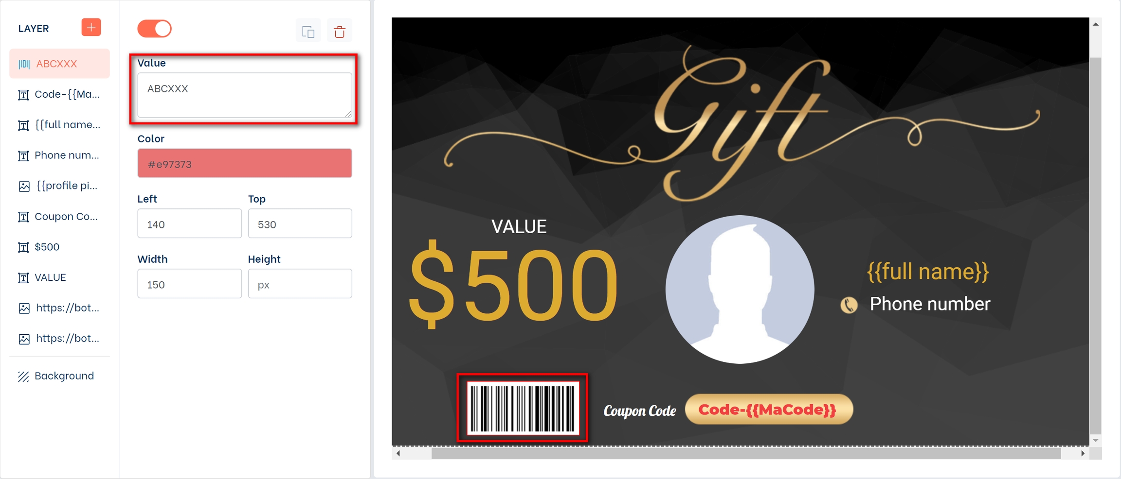 Barcode Layer giúp bạn tạo ra 1 barcode (mã vạch), bạn có thể khai báo value là 1 giá trị cụ thể (ABCXXX)