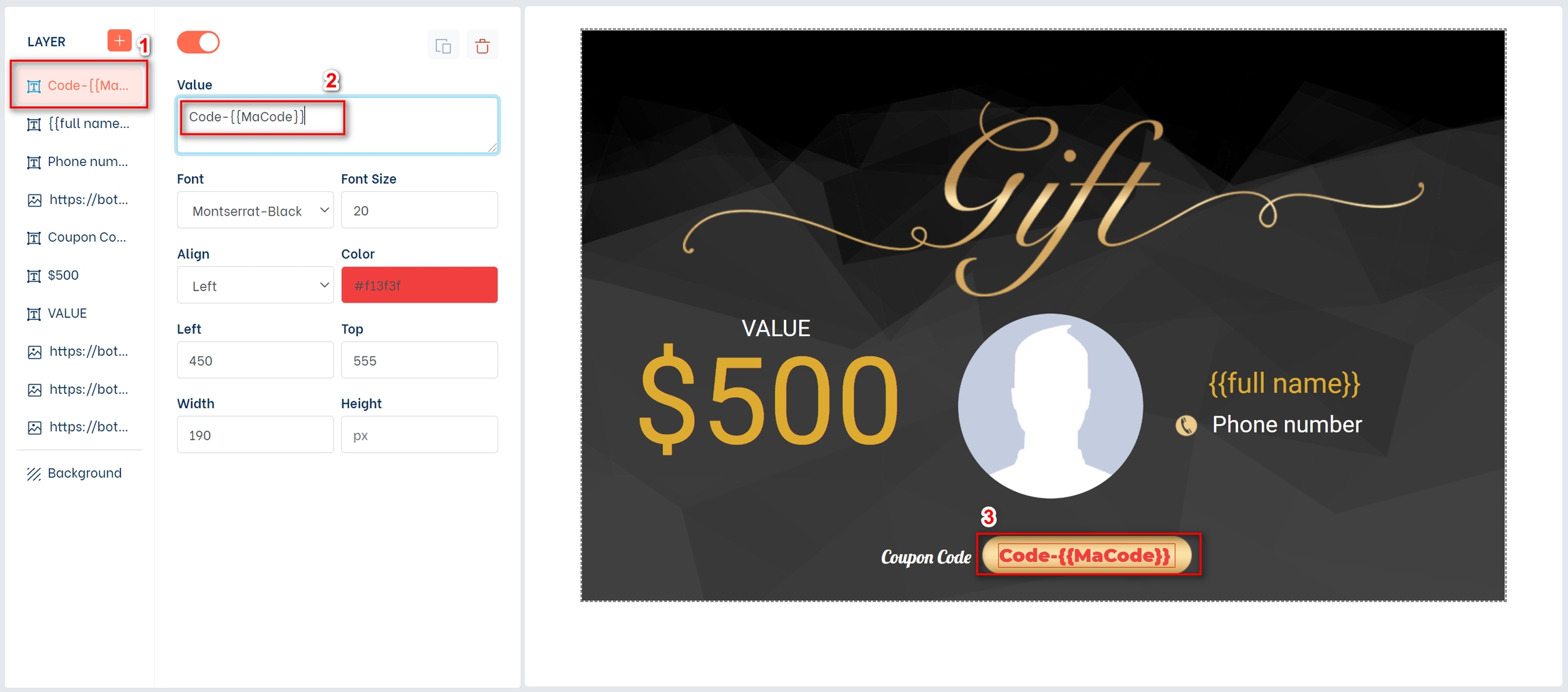 Text layer là thẻ nội dung, các bạn có thể nhập text hoặc thuộc tính của khách hàng