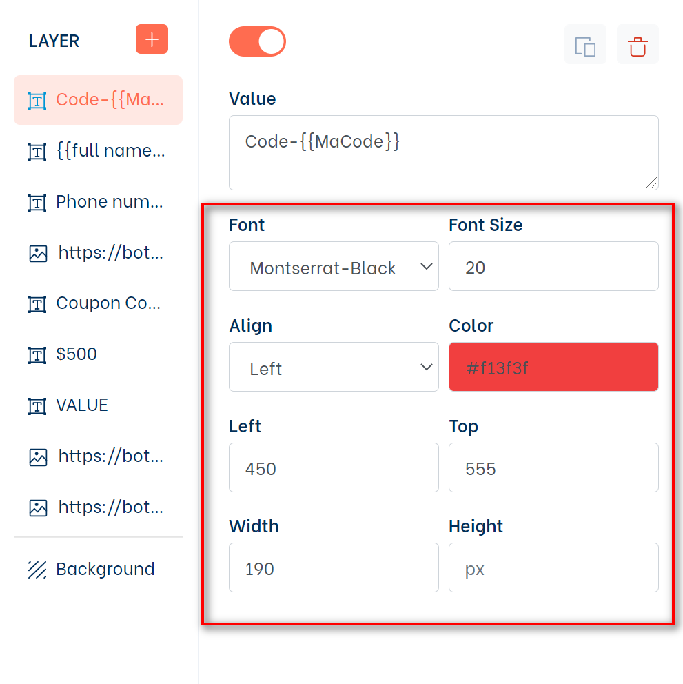 Các bạn có thể cấu hình font chữ, và size, màu sắc của chữ. Phần left và top là tọa độ của vị trí layer khi các bạn kéo thả layer trên màn thiết kế.