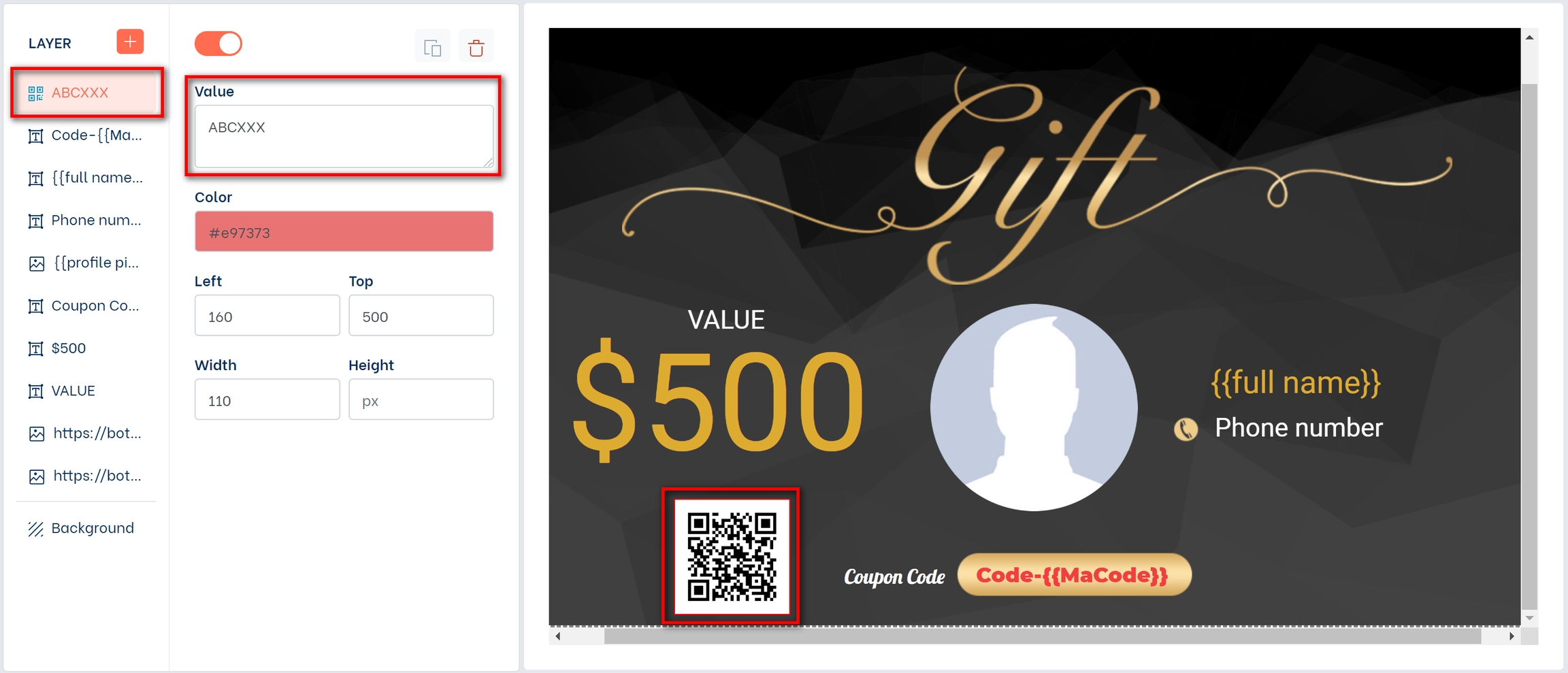 QR code Layer: Giúp bạn tạo ra 1 qr code, bạn có thể khai báo value là 1 giá trị cụ thể (ABCXXX)