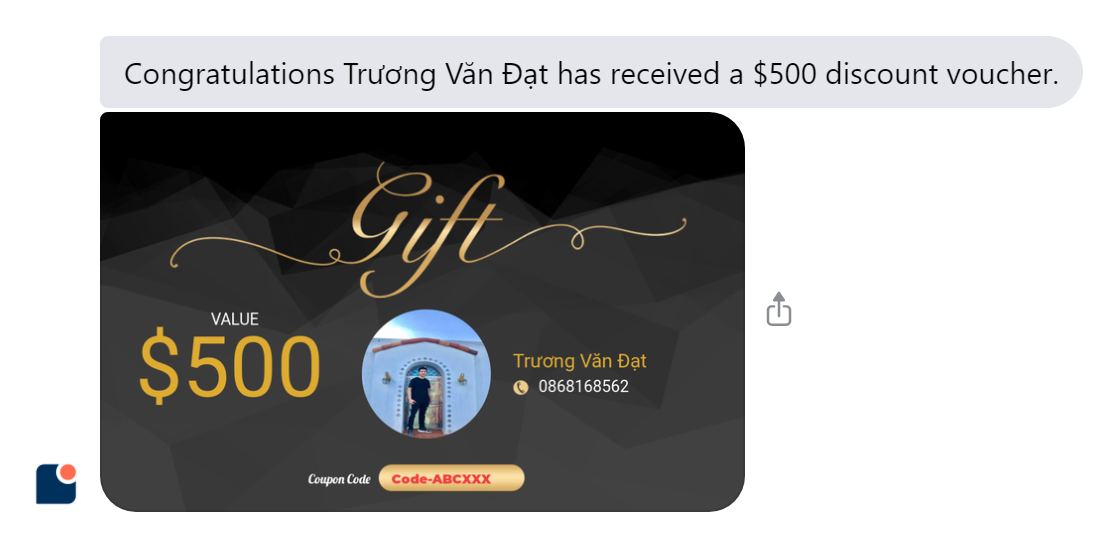 Sau khi nhấn Preview bot sẽ gửi 1 nội dung kèm hình ảnh được tạo cá nhân hóa cho khách hàng.