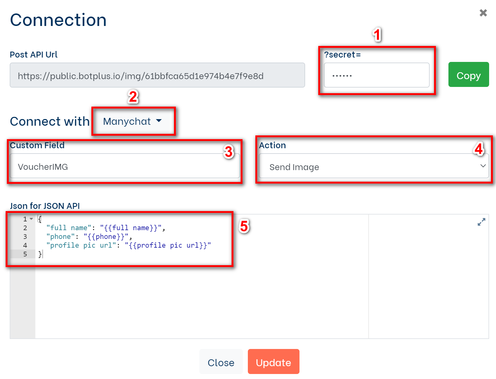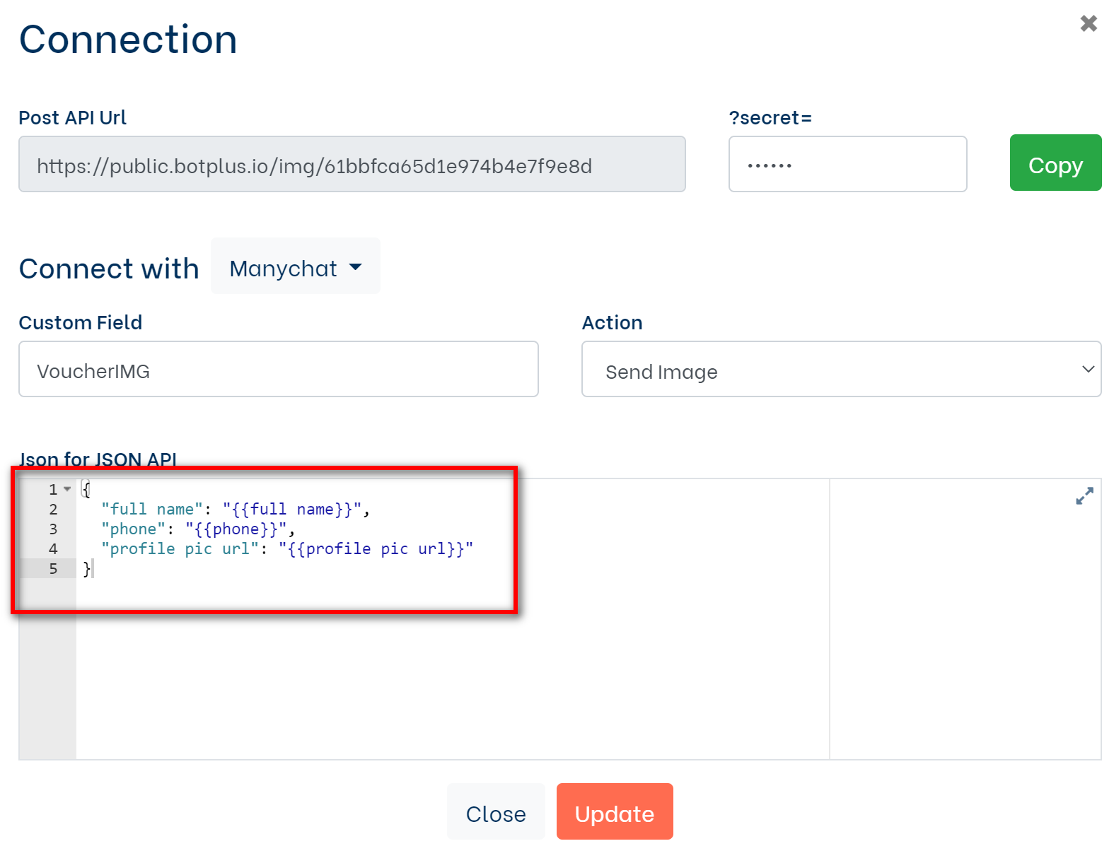 5: Json kết nối dùng để kết nối truyền dữ liệu từ Manychat tới plugin trên botplus.io