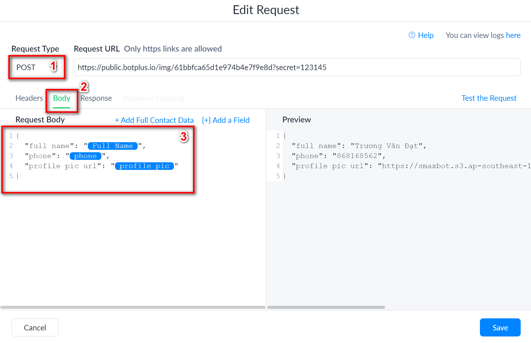 3: Dán nội dung vừa copy trên plugin vào Request Body và nhấn Save để lưu cài đặt.
