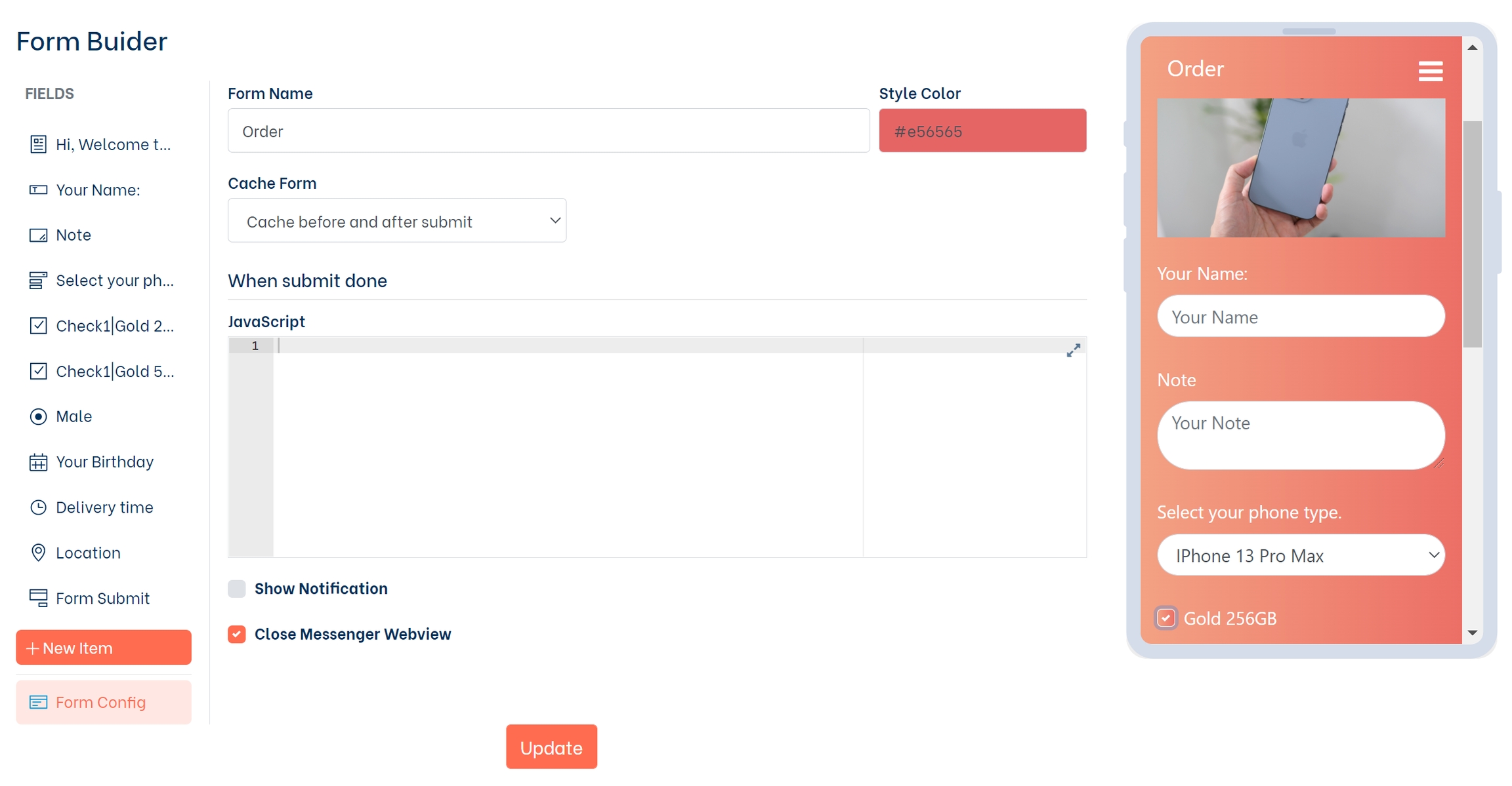 Close Messenger Webview: Tính năng này khi bạn sử dụng form trong chatbot khi khách hàng ấn gửi thông tin thì form (popup) sẽ tự động đóng lại.