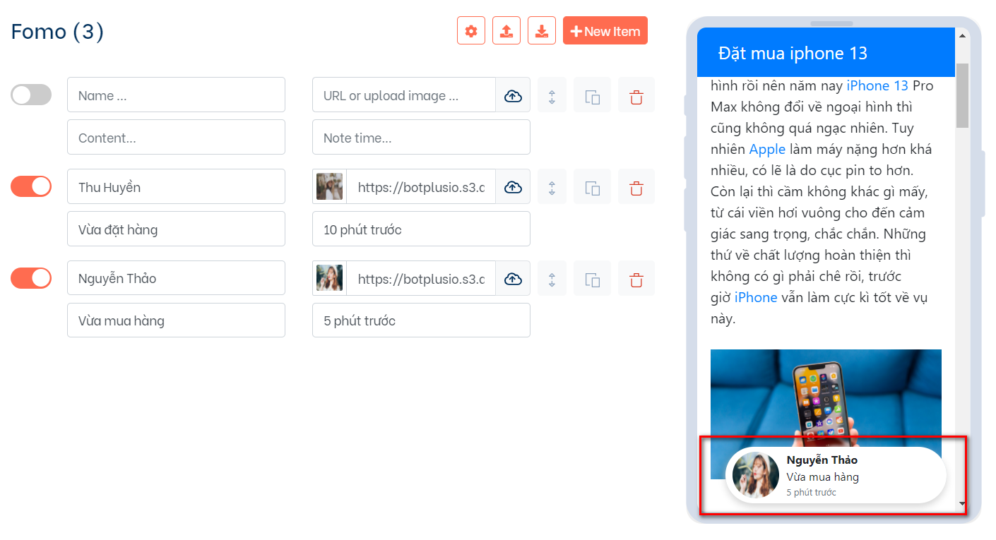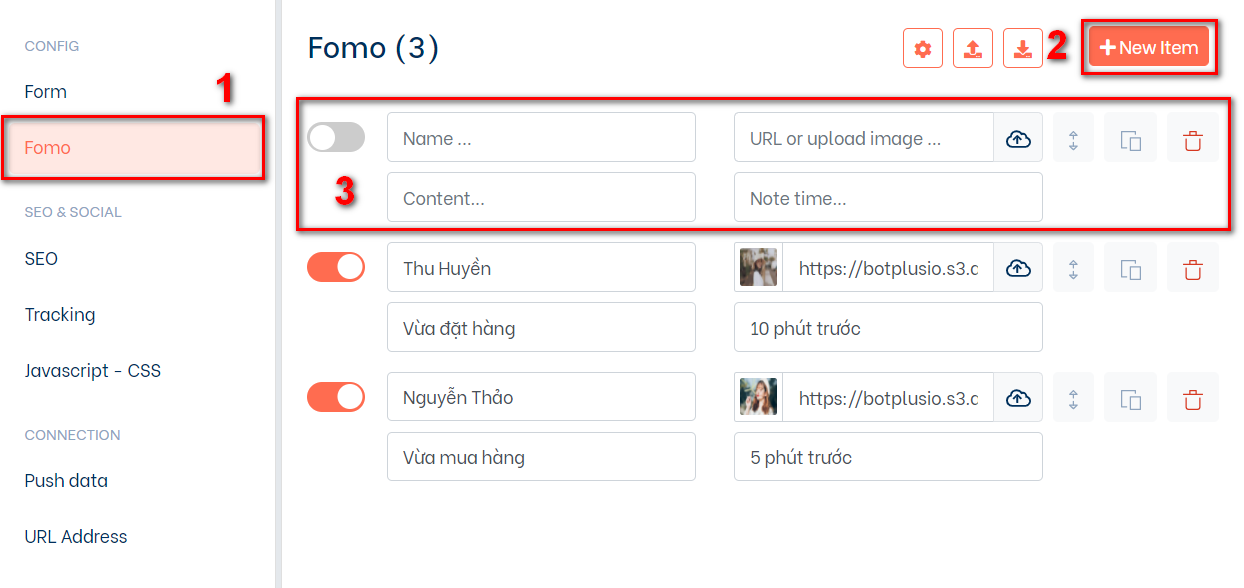 Ở phần 3 các bạn lần lượt điền các thông điệp mà bạn muốn fomo (lưu ý bạn cần phải bật button