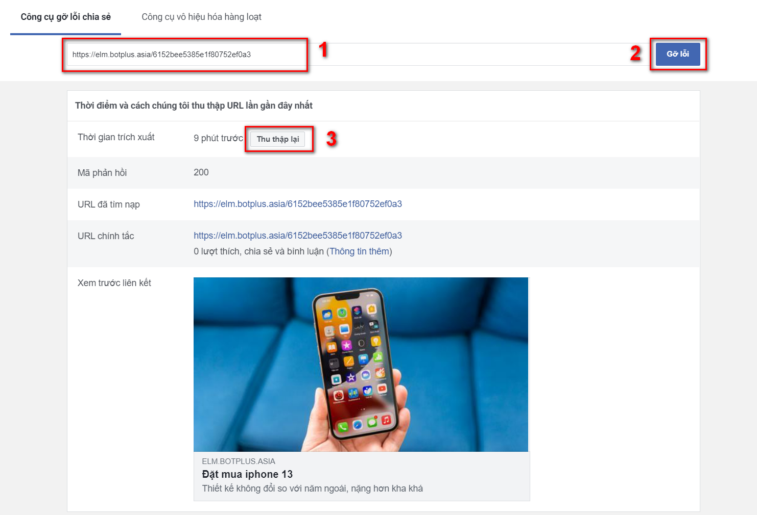 Sau đó bạn dán link vào mục (1) và click vào mục (2) để xem thumb hiện tại, bạn click vào mục (3) để hệ thống cập nhật lại thông tin mới.